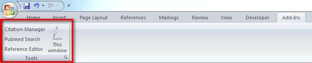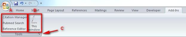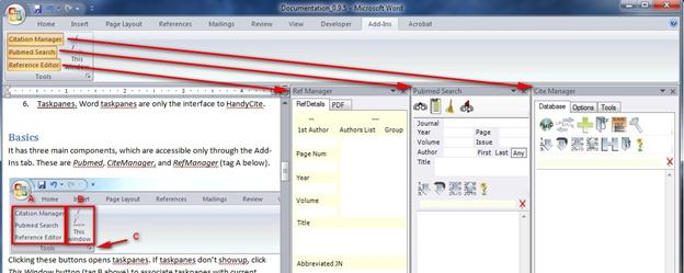 Taskpanes. Word taskpanes are only the interface to HandyCite. BasicsIt has three main components, which are accessible only through the Add-Ins tab. These are Pubmed, CiteManager, and RefManager (tag A below).