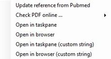 a. Globe - This icon is visible if a reference has Pubmed ID in database. It can be used in following ways i. Click – opens the reference from Pubmed website in a taskpane ii. Shift-click or Double-click– opens the reference from Pubmed in external default browser iii. Ctrl-Click – opens the reference using custom string in a taskpane. The custom string can be changed in ‘Options’ tab. This can e.g. be used to open the reference at Pubmed site with your university link. iv. Ctrl-Shit-Click – opens the reference using custom string in external default browser. v. Right-click – opens shortcut menu