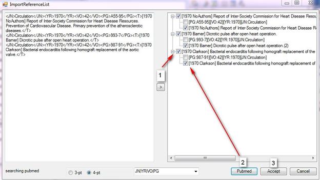 in list and document). 11. Database (this list) a. Save – same as ‘save reference file’ button b. Load – same as ‘load reference file’ button c. Load file – loads a database reference file that is not associated with current document d. Get references from document – generates database list from references used in document e. Get reference file – Recursively loops through a folder and all subfolders to see if the highlighted/selected references pdf exists. If it does, it copies it to the ‘ref’ subfolder of current document. This can be used to find previously downloaded pdf files. However, depending on the folder size, it may take a while and hold system. 12. Select – highlights/selects 13. Import list – Opens a form that tries to find the references on Pubmed based on year, first page, volume and journal name (4-pt). 3-pt option ignores journal name. It can work on highlighted references or a list can be pasted from clipboard. If references are copied from a PDF file, then line breaks can be fixed using ‘Fix PDF’ option from right click context menu. After pasting the list in the left side, -1- recognizes the key fields, -2- Pubmed button, finds the checked references on Pubmed using key fields (3-pt ignores journal name), and -3- Accept button closes the form and imports all checked found references to the database list.