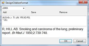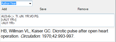 HandyCite can create three types of citation formats 1. Serial index numbering in document and in reference list – index numbering sorted by citation order in document (e.g JAMA, NEJM) 2. Index numbering in document and alphabetical author names in reference list – index numbering sorted by author name (e.g. Neurosurgery) 3. Author name +/- Year in document and same in reference list – sorted by author-year combination. Each style is defined in three lines. First line defines the formatting of reference in reference list. In example below AU3>6 means to list 3 authors if more the 6. <,> means to use comma as separator in author list. Other formatting elements are used as such. iJN means to italicize journal name.
