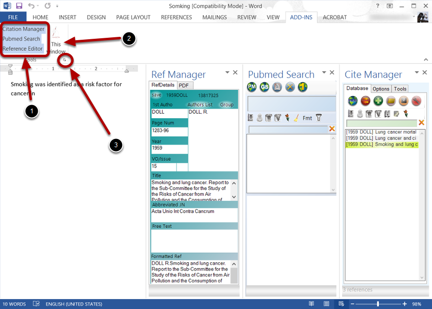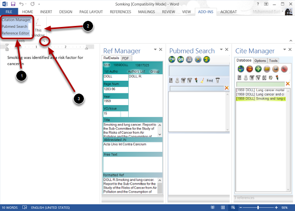 It has three main components, which are accessible only through the Add-Ins tab. These are Pubmed, CiteManager, and RefManager