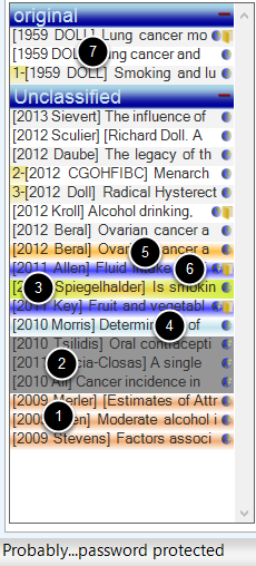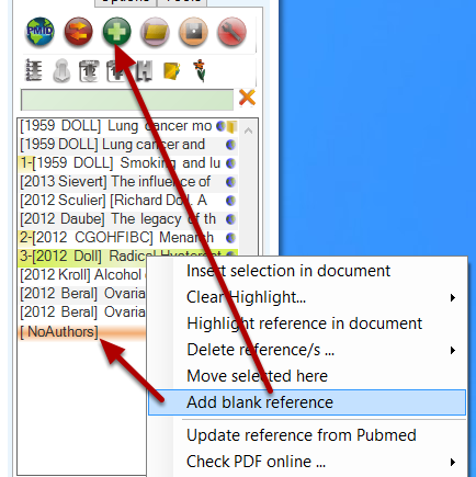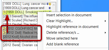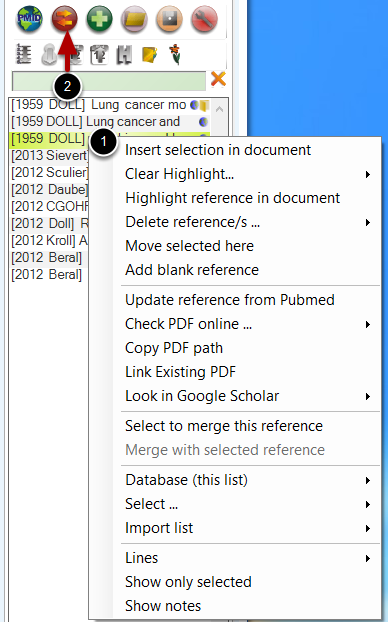 (1) Insert selection in document Adds the currently selected reference in the document (at cursor). The reference numbering is automatically updated when a reference is inserted. In large documents (>200 inserted fields and >200 references in database), this process may take a few seconds. To enable/disable automatic update use Ctrl- update (2) button.