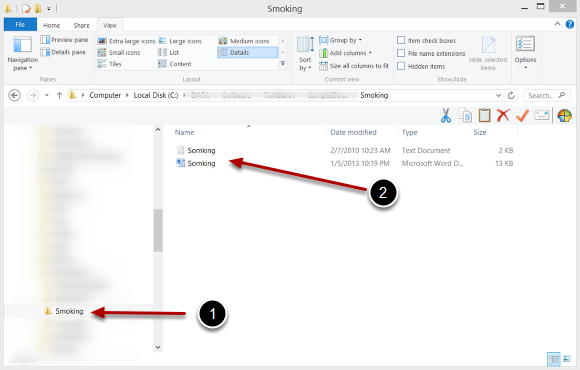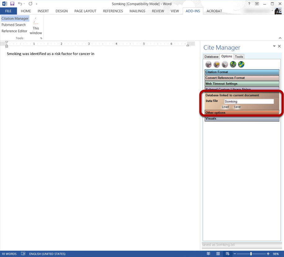 HandyCite stores the references list database as text files. These database files are stored with same name (except *.txt extension) and in the same folder as the document file (1). Since it uses the current document name and folder, it does not ask for a database name when saving or loading a reference database file. For example if document is c:\......\smoking.docx (2), the database file will be c:\.....\smoking.txt. (2)