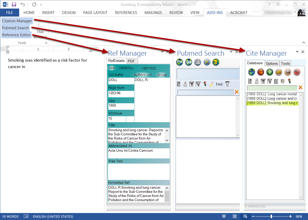 All handyCite functions are divided in 3 taskpanes. These can be turned on by the ribbon buttons.